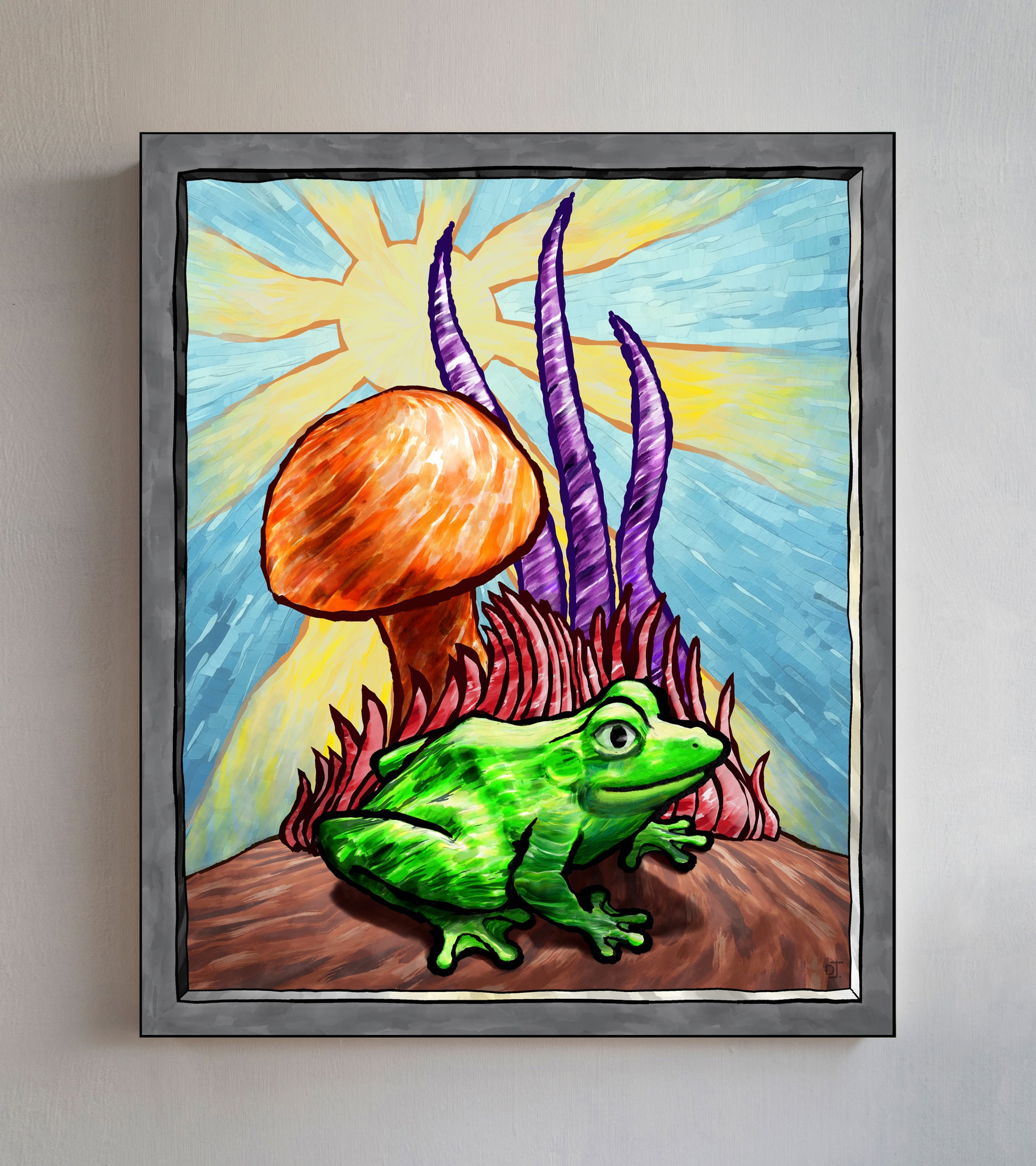 Bring some joy into your home with this charming little green frog! Surrounded by whimsical, strange vegetation under a radiant yellow sun, this frog is happy and fun! Its cute, upbeat vibe is sure to add a touch of positivity to any room, making it a perfect addition for anyone looking to brighten their space with a cheerful, lighthearted piece of art.